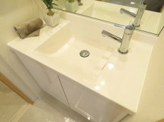 白で清潔感たっぷりの洗面化粧台。小物は鏡の横に設置されたキャビネットへどうぞ。