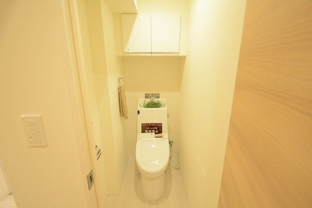 トイレはウォシュレット付き。ペーパーのストックや掃除道具の保管に便利な吊戸棚も設置されています。