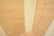 廊下に設けた収納棚は、掃除機などのお掃除グッズや洗面周りのストック類などの収納にも便利です。