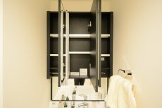洗面化粧台は鏡の裏が一面収納になっており、ゴチャゴチャ散らかりがちな小物類がスッキリ片付けられるようになっています。
