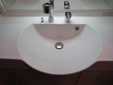 半月型のボウルが洗練された印象を与える洗面室。化粧台もゆったりワイド幅