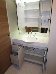 裏はキャビネット収納になっており、歯ブラシ・歯磨きペーストなどの細々した