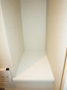 ウォシュレット付トイレ。上部の吊戸棚に加えて、横手にはミニカウンター?が