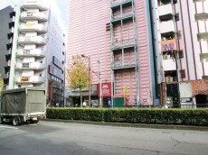 西口の五差路から、ロサ会館(ピンクの建物。映画、ボーリングなどお楽しみ
