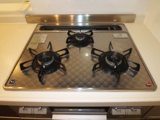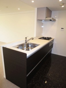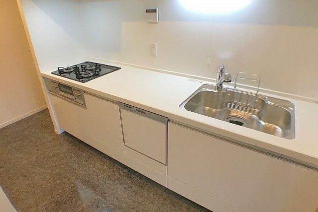大理石調の床に人造大理石のトップが映えるキッチン。三口コンロに浄水器一体型