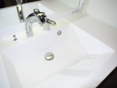 続いて洗面室。継ぎ目のない、美しいホワイトの洗面ボウルが眼を惹きます。