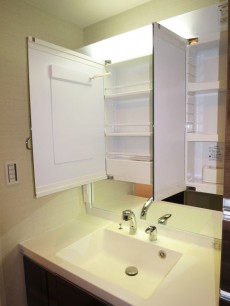 三面鏡の裏側もキャビネット収納となっているので、洗面ボウルの周囲に