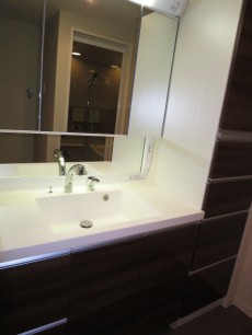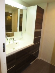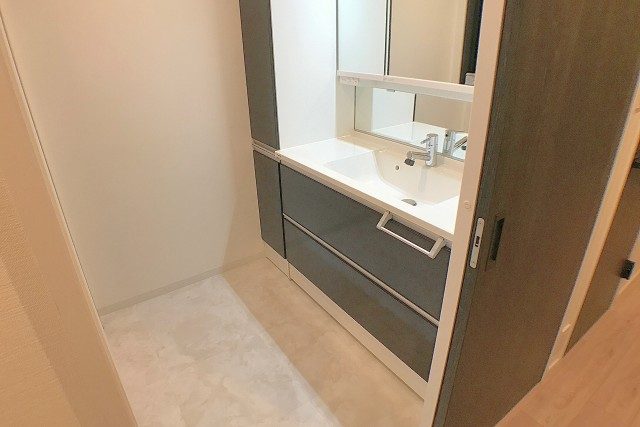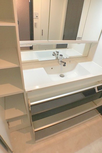 洗面化粧台も、ゆったり広々ファミリーサイズ。しかも右手にがっつり収納が