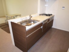 床面はかすかに光沢あるダークブラウンです。作業スペースも広々(キッチン天板