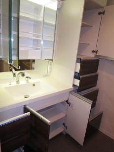 三面鏡の裏側はキャビネット収納となっておりますので、洗面台まわりに散らばり