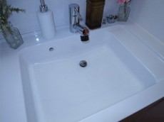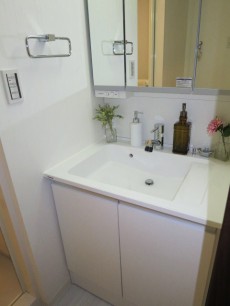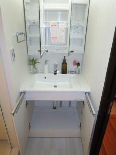 ホワイトカラーが清潔すっきりな洗面化粧台。洗面台まわりはウェットエリアと