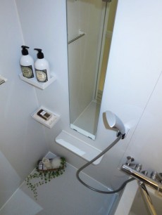 バスルームも機能的シンプル。小物を置くトレイが2つコーナーに設置されて