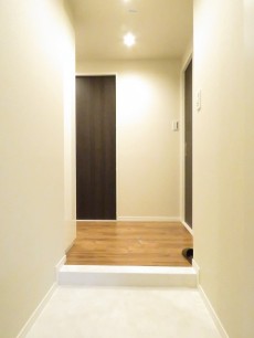 玄関先は廊下。建具もフローリングも木目調であたたかみのある雰囲気です。こちら側にあるトイレ、洗面室から順番に見ていきましょう。