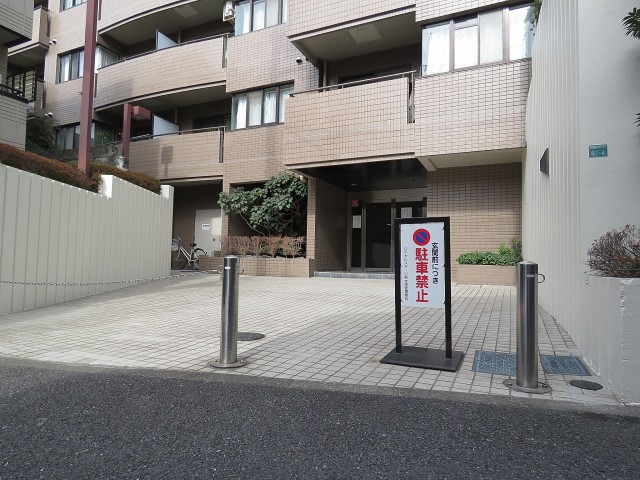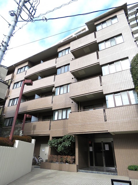 春日通りから少し中に入ったところにあるベージュのタイル貼りのマンションです。