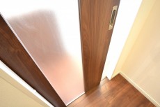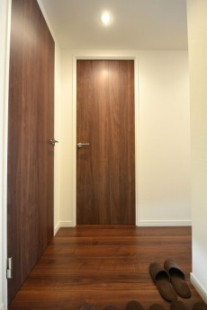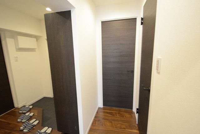 廊下を右方向へ。トイレ、洗面室、LDKの扉があります。