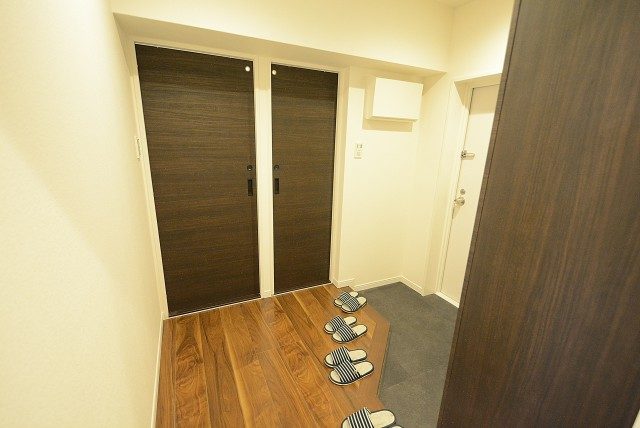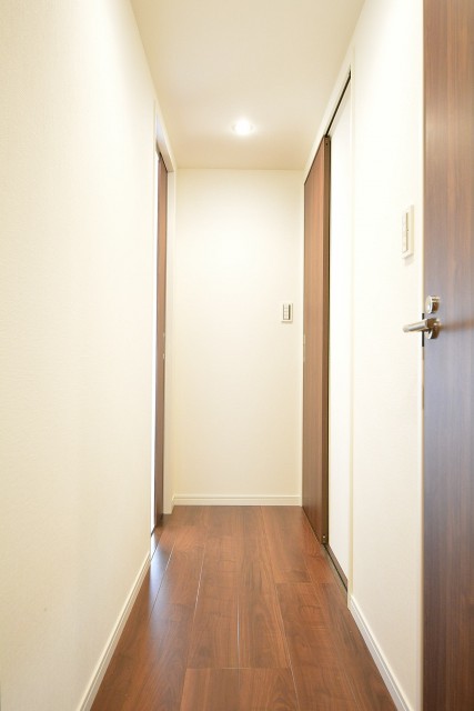 玄関をあがると洋室の扉が2つあり、さらに右側に廊下が伸びています。