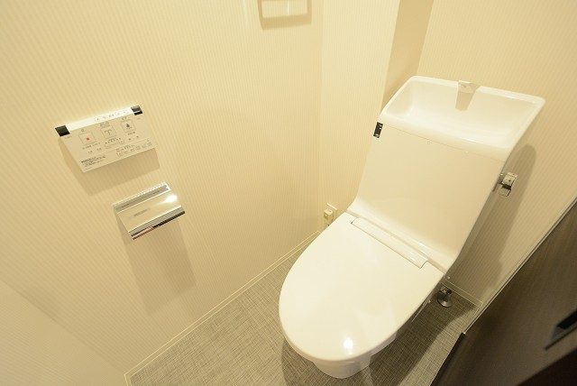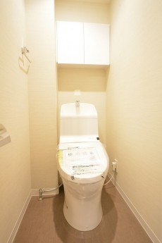 トイレはウォシュレット付き。上に設置された棚にペーパーのストックや掃除用具を入れれば足元もスッキリ。