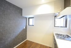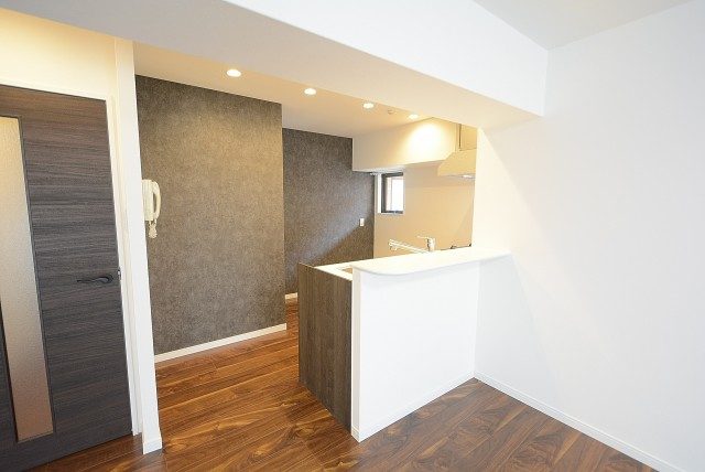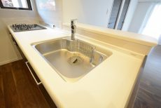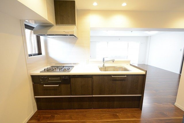 キッチンは開放感のある対面式。キッチンスペース上にはダウンライトが設置されています。