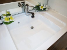 ホワイトカラーが清潔な印象を与えてくれる洗面化粧台。継ぎ目のない洗面