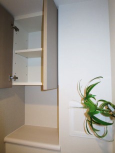 扉がある収納にはトイレットペーパーなどを収納して、カウンター部分にはお好み