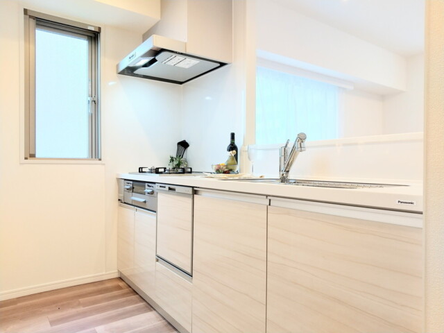 料理による汚れや人目を気にしなくていい使いやすさと、解放感のバランスの取れたキッチンです。窓も付いているので気になる臭いもしっかり換気出来そう。換気扇はお料理を始める少し前から回しておくと効果的らしいですよ。みんなの憧れ食器洗浄乾燥機付き♪