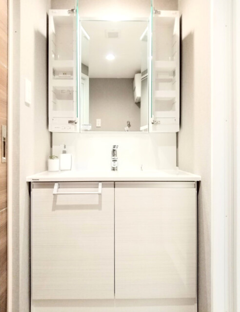 三面鏡(くもりシャットミラーです)裏側はキャビネット収納となっており、洗面台