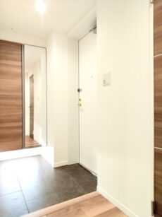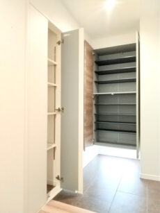 アルコーブ付きの玄関を入ると、中は正方形に近い比較的ゆったりとした空間になっています。シューズボックスは収納力のあるトールタイプ。扉に姿見が付いているのでお出かけ前の身だしなみのチェックにも便利ですよ。