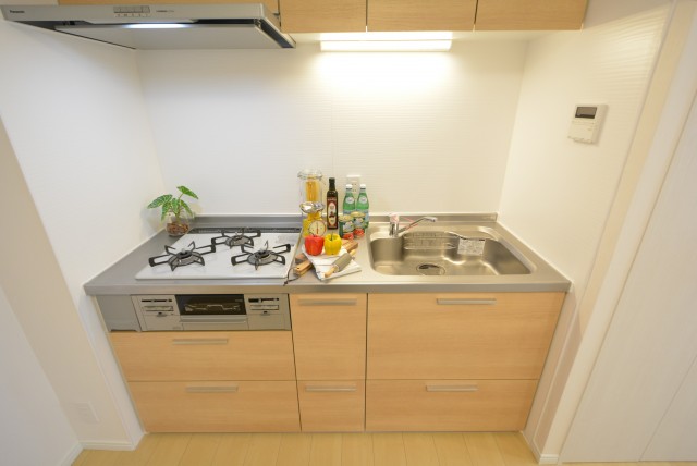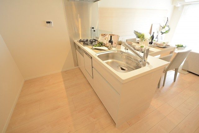 浄水器付きの水栓、3口のグリル付きガスコンロ、食器洗浄機が付いています!