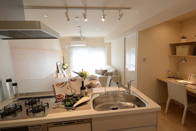 壁際にコンロがあることから、油はねなどの汚れが飛びにくく、開放感や作業スペースの広さも持ち合わせている、かなりバランスの良いキッチンですよヽ(´∀`)