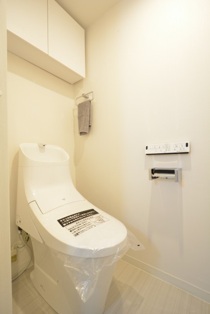 吊戸棚も付いているので、トイレットペーパーのような消耗品から掃除用品まで収納が可能です。扉があるので内部が見えないのもGOODです( ´∀`)b