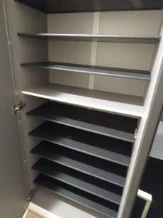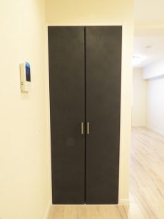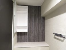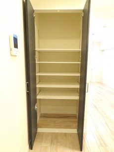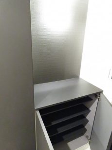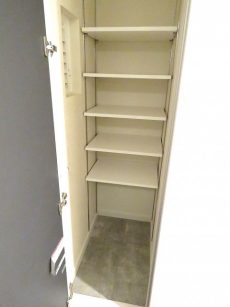 シューズボックスは廊下に上がった所にありました。トールタイプで収納力抜群、棚も可変でブーツなどでも収納可能ですよ。人感センサーが自動的に照明を点けてくれるので、暗い中スイッチを探す必要もありません。