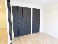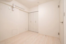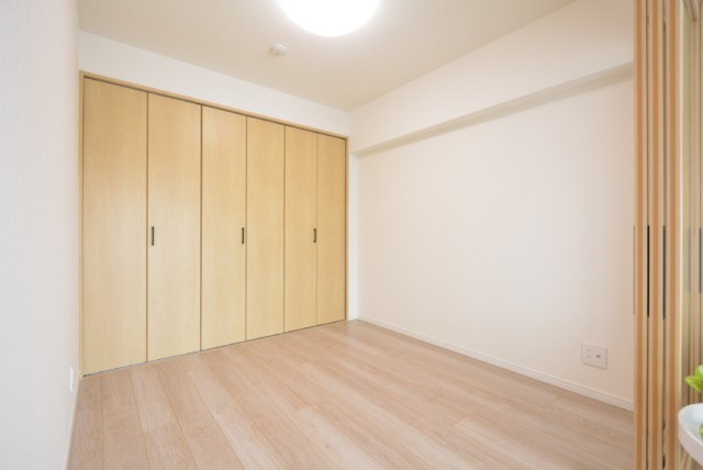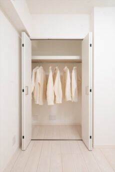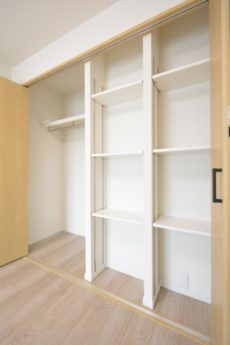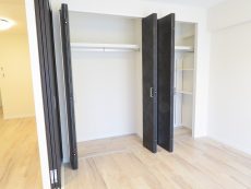 収納はクローゼット。奥行きタップリ、フルオープンになって使いやすそうです。床部分を空けておくのはもったいないので衣装ケースなどでさらに収納力をアップさせましょう。