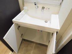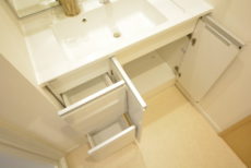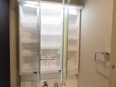 収納は洗面台下と三面鏡裏のキャビネット。キャビネットは細かい物が多くなりがちな洗面にはピッタリの収納ですね。