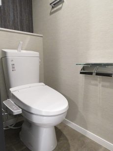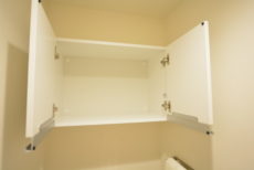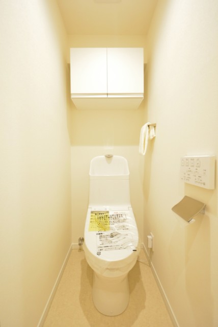 吊戸棚と温水洗浄便座付き。低い位置に設置された吊戸棚に優しさを感じます(^^)温水洗浄便座はTOTO製のウォシュレット。ちなみに、他社の製品はウォシュレットって言わないんですよ。ご存知でしたか?