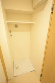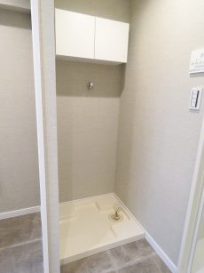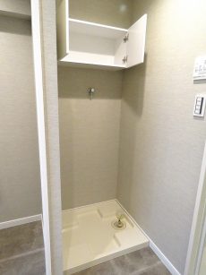 こちらには、洗面台、トイレ、浴室、洗濯機スペースがまとまっています。洗濯機スペースは棚付きで、洗剤などをすぐ手が届く所に置いておけますよ。