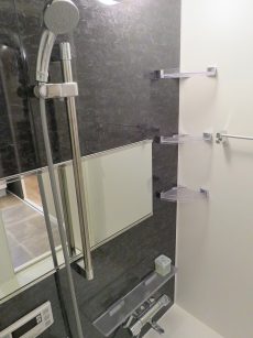 天然石のような柄が入った壁パネルでバスルームは落ち着いた雰囲気。
