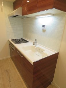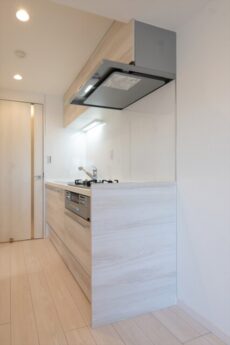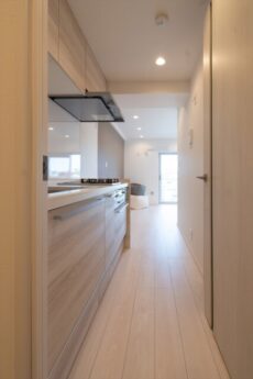 突き当りのドアを開けるとキッチンになっていて、その向こうにリビングダイニングが続いています。キッチンスペースを廊下と兼ねることで省スペースを実現しているんですね。調理台は明るい木目調でお部屋の雰囲気によく合っています。グリル付きの3口コンロと調理環境も充実。
