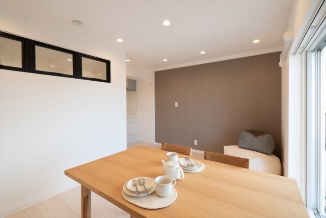 ナチュラルカラーでまとめられた中で、内窓の黒枠がいいアクセントになっていますね。ディスプレイの家具はナチュラルテイストですが、モダンなモノトーンもよく似合うと思いますよ。