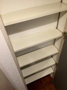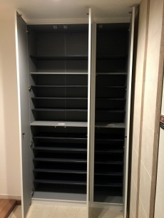 玄関正面には、光沢感のあるトールサイズのシューズボックスがあります。収納力バツグンです (●´∀`)可動式の棚なので、靴のサイズに合わせてご自由にアレンジしてください☆