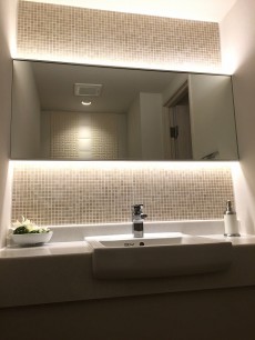 ワイドなミラーがポイントのバスルームは、スタイリッシュな空間に(*´˘`*)洗面台と統一感のあるやさしいホワイトの木調パネルです。ゆっくり大きなバスタブにつかって疲れを癒せそうです♪♪