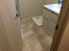 廊下左手が、水回りを集めたサニタリールームになっています☆少しですが段差もあるのでお気を付けください。右手手前に洗面台、奥に洗濯機置場、正面にバスルームの配置です。