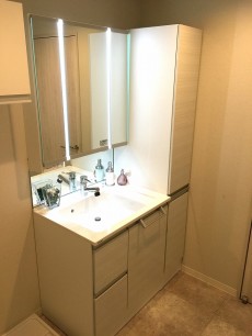 やさしい風合いのホワイトの木調の洗面台はとても明るい洗面台♪♪
