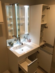 三面鏡の裏側、洗面ボウルの下、横にはキャビネットと収納力バツグンです♪♪リネンの収納にも困りません。シャワーヘッドも嬉しいです♪♪