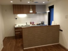 お部屋と統一感をもたせたブラウンの木調のシステムキッチンです♪♪ゆとりのある広さです。