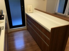 キッチンとリビングダイニングとの間にはエコカラットをあしらったカップボードが設置されています。収納も充実・お料理の段取もしやすくテキパキできそうです。