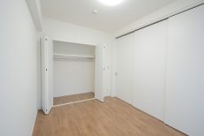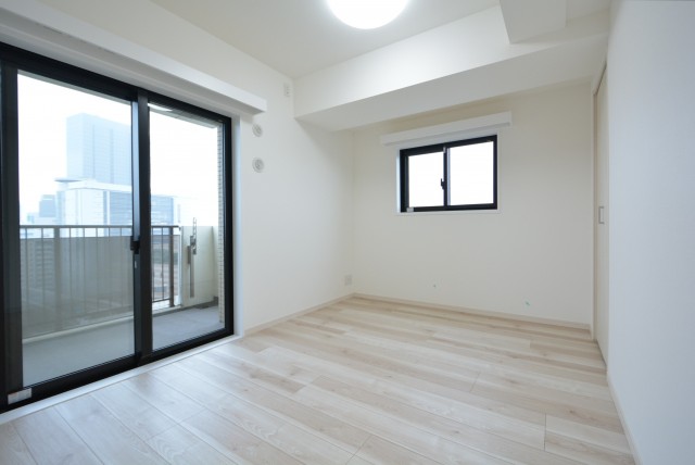 大きい方の窓はバルコニーに面していて、小さい方の窓の外には開放感のある眺めが広がっています。収納はクローゼットになっていました。