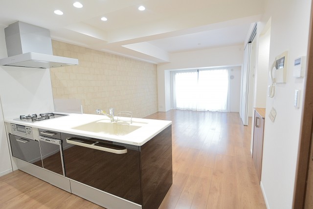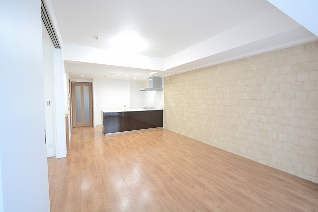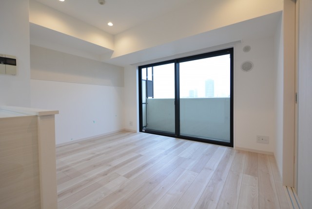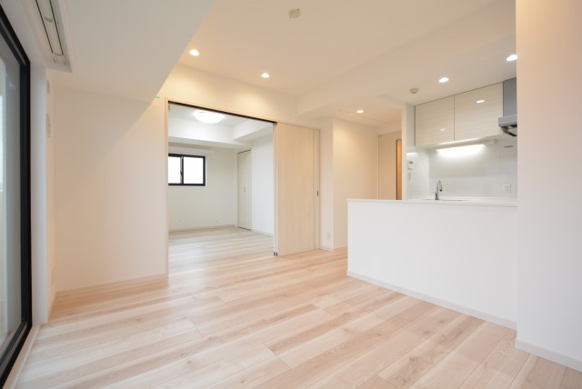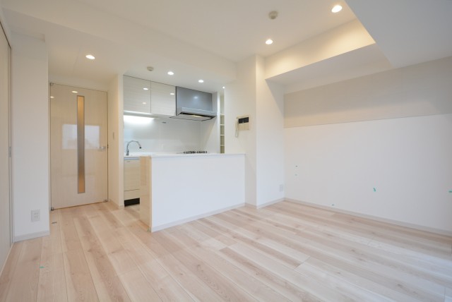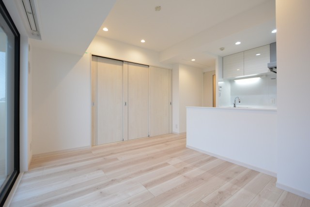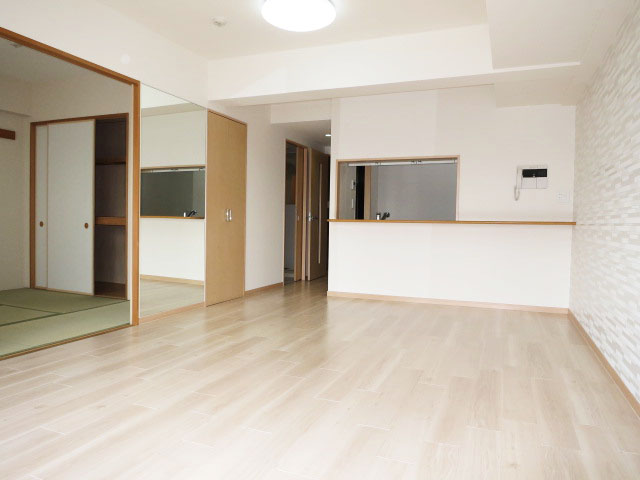 約14.3帖のリビングダイニングキッチン。ほぼ南向き&フローリングがホワイトに