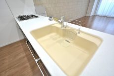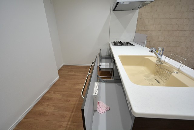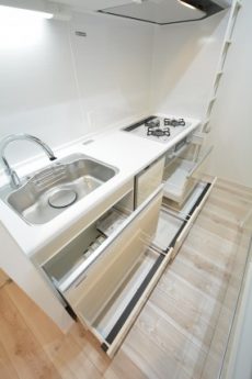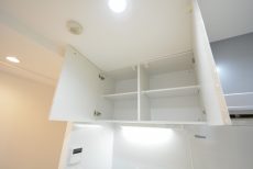 収納は調理台の下と、上部の吊戸棚になります。吊戸棚はどうしても出し入れがしづらくなりますので、あまり使わないお鍋などを入れる事になりそうです。