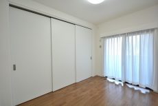 廊下と同じフローリングに白のクロスの、ナチュラルテイストのお部屋ですね。正面にはバルコニーに面した南東向きの窓があり、柔らかな光が入ってきています。今日はあいにく雨ですが、お天気が良ければ陽当り良さそうですよ。
