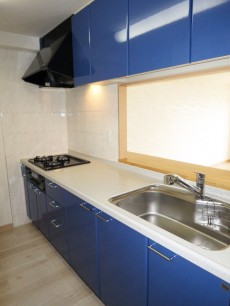 こちらも鮮やかなブルーのキッチン。シンクも作業スペースもゆとりをもった